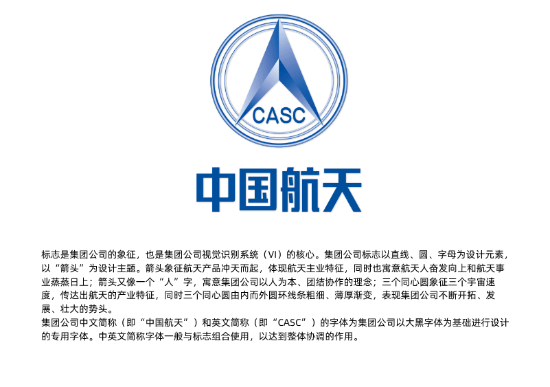 標(biāo)志是集團(tuán)公司的象征,也是集團(tuán)公司視覺(jué)識(shí)別系統(tǒng)(VI)的核心。集團(tuán)公司標(biāo)志以直線、圓、字母為設(shè)計(jì)元素,以“箭頭”為設(shè)計(jì)主題。箭頭象征航天產(chǎn)品沖天而起,體現(xiàn)航天主業(yè)特征,同時(shí)也寓意航天人奮發(fā)向上和航天事業(yè)蒸蒸日上;箭頭又像一個(gè)“人”字,寓意集團(tuán)公司以人為本、團(tuán)結(jié)協(xié)作的理念;三個(gè)同心圓象征三個(gè)宇宙速度,傳達(dá)出航天的產(chǎn)業(yè)特征,同時(shí)三個(gè)同心圓由內(nèi)而外圓環(huán)線條粗細(xì)、薄厚漸變,表現(xiàn)集團(tuán)公司不斷開(kāi)拓、發(fā)展、壯大的勢(shì)頭。