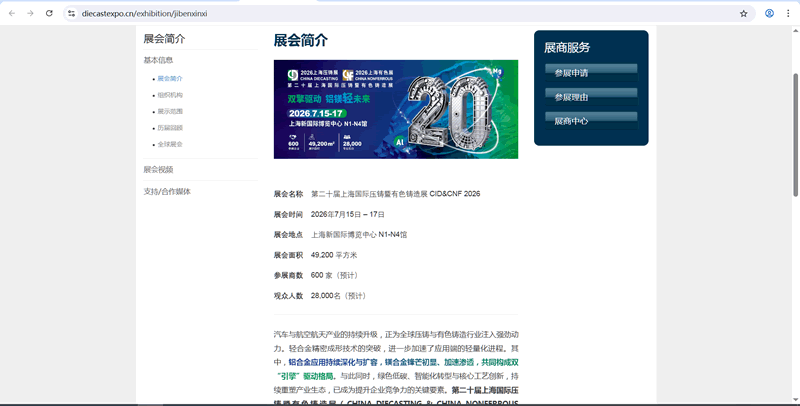 展會名稱 第二十屆上海國際壓鑄暨有色鑄造展 CID&CNF 2026